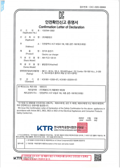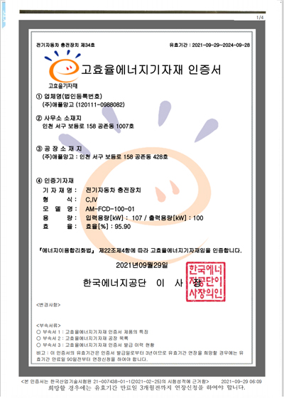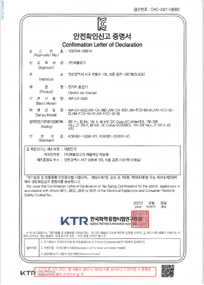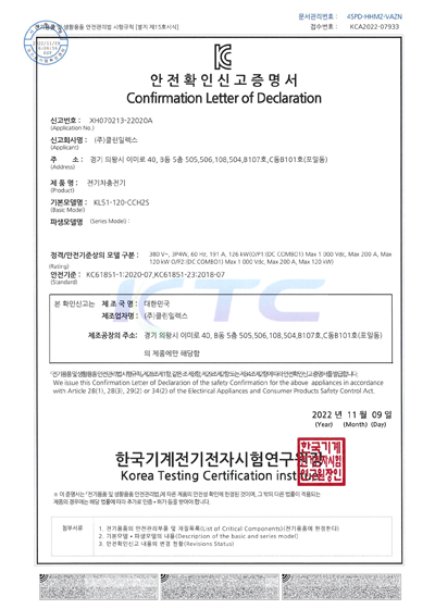 KC안전확인신고증명서 클린급속충전기 100KW